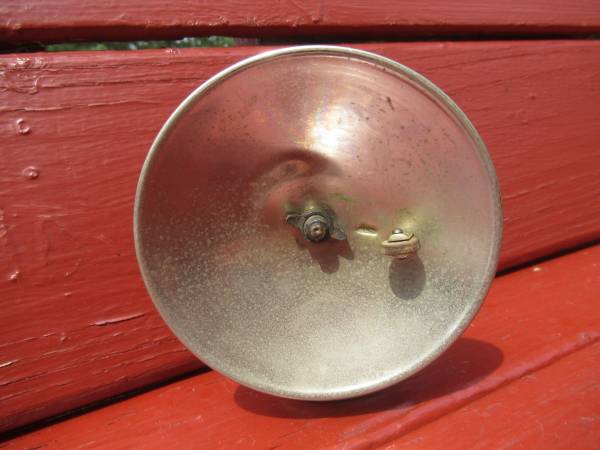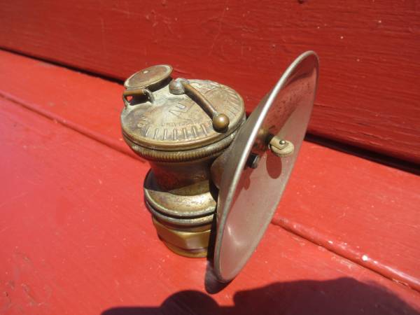 Auto-Lite Miner’s Carbide Lamp with large 4” reflector. The body of the lamp is brass plated. The top lid flips up while the lower compartment screws off. The top selector arm moves as it should. The back clip is missing. Nice large reflector Auto Lite carbide lamp.
